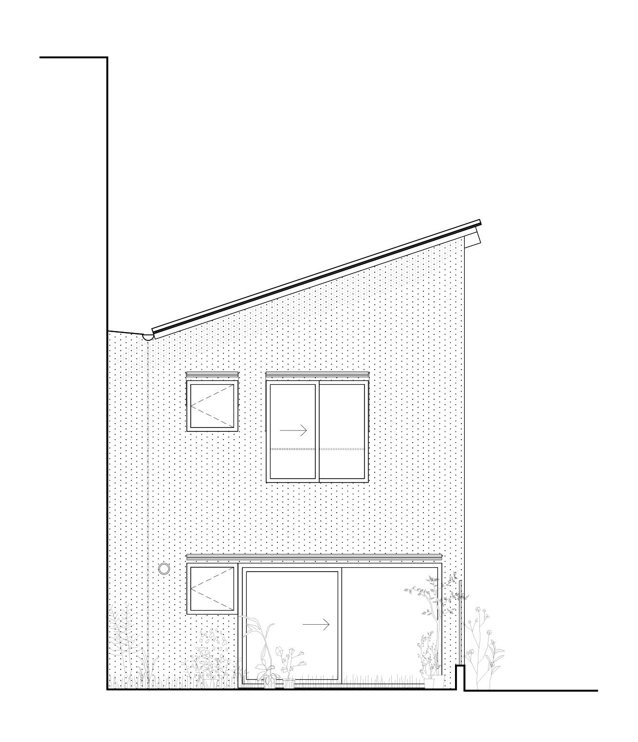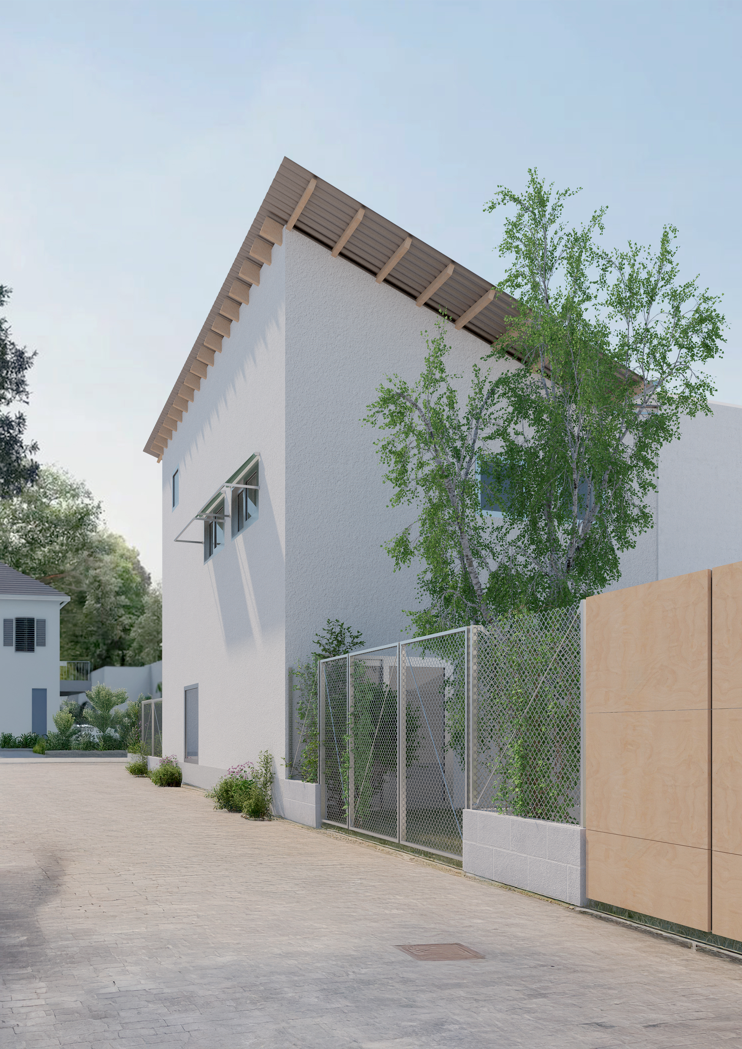 La disposition du projet en séquences jardins/maisons/cours est typique du tissu pavillonnaire autour de la rue Anatole France. Elle présente l'avantage d'une inscription douce dans le contexte, tout en permettant une relation contrôlée avec la rue. Les ouvertures sont majoritairement orientées sur l’intérieur de la parcelle, limitant les effets de vis à vis. Les plantations des cours et jardins contribuent à renforcer l’ambiance pittoresque des rues adjacentes. Ces espaces libres maintiennent des dégagements cruciaux pour les voisins dont la façade est orientée sur la rue.