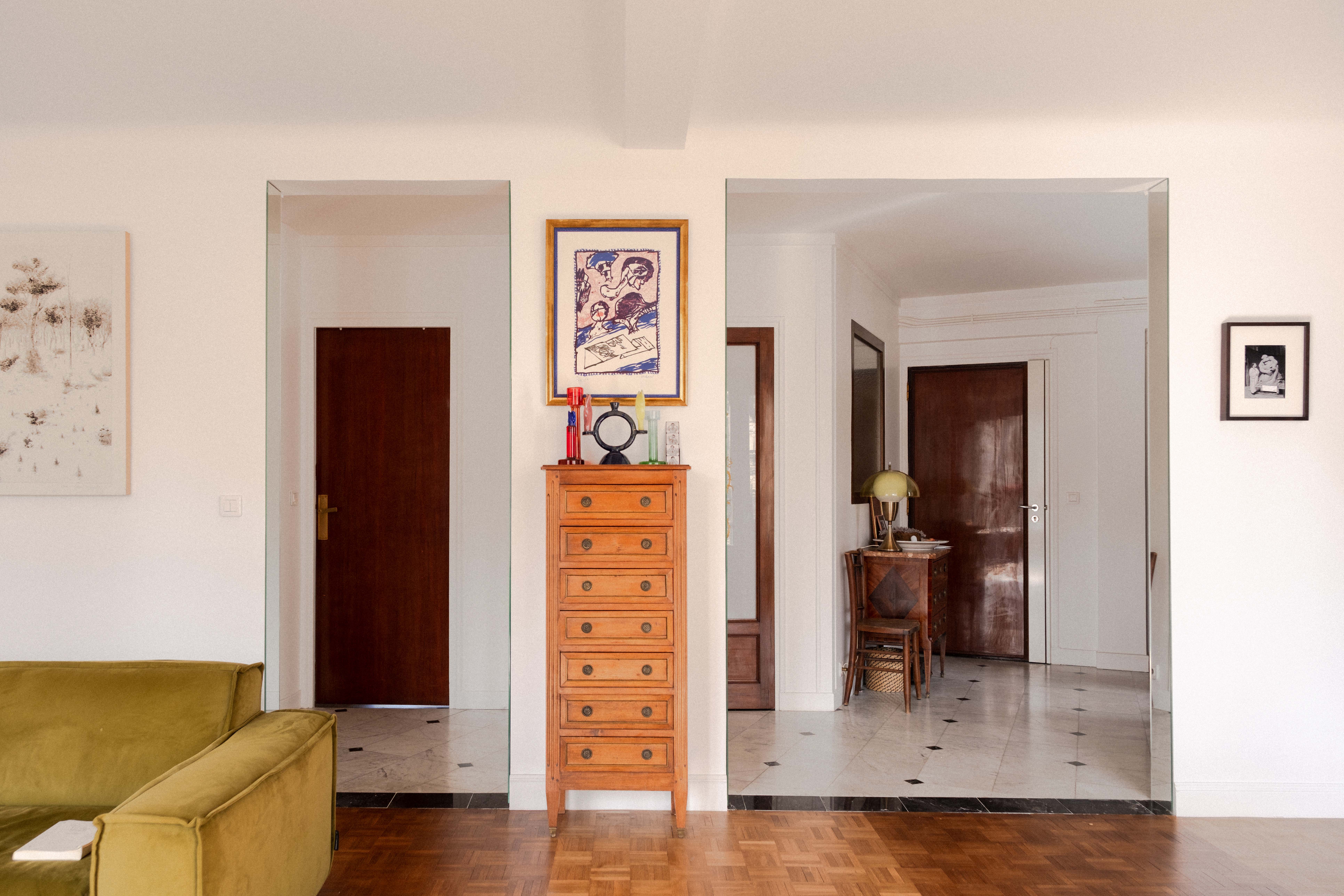 Les interventions sont minimales : il s'agit davantage d'un processus de soustraction d'éléments que d'ajouts. Les proportions du grand salon existant sont maintenues, et la fluidité entre les espaces est favorisée en supprimant les portes entre l'entrée, la cuisine et le salon.