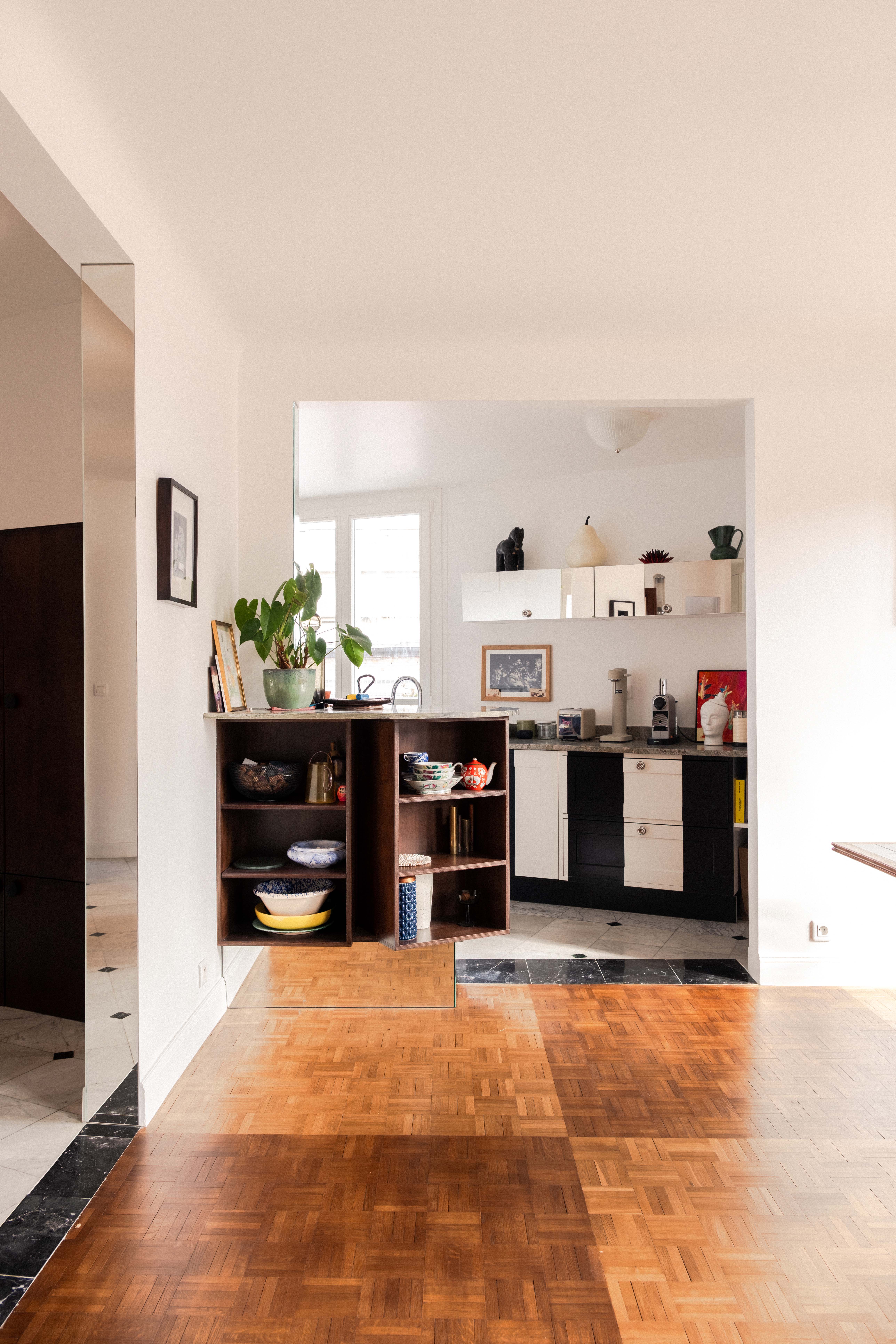 Les parquets en bois sont poncés et peints pour créer un motif de damier, basé sur la disposition des anciennes tuiles en chêne. Des sols en marbre de réemploi sont mis en oeuvre dans la salle de bains, complétant harmonieusement les sols originaux conservés du hall d’entrée et de la cuisine.
