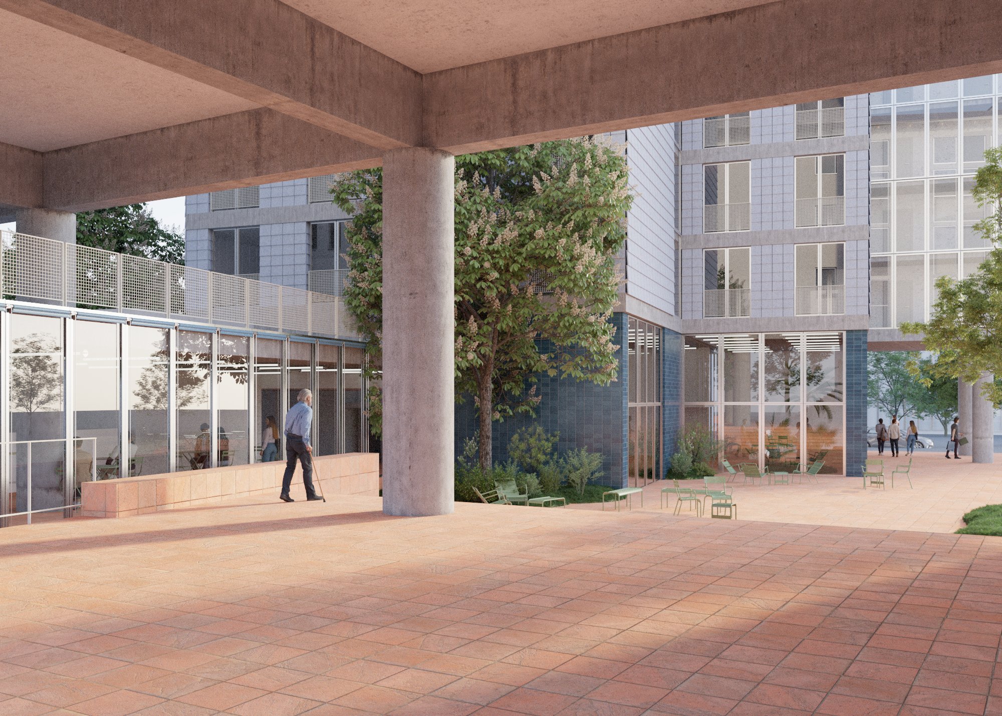 Deux strates horizontales organisent le bâti : le monde du public, au rez-de-chaussée, qui accueille les commerces, restaurants, espaces de co-working et l'accueil de l'hotel ; le monde du "haut", dévolu aux résidents, qui accueille des terrasses servant d'espaces partagés et de fond de scène aux logements.