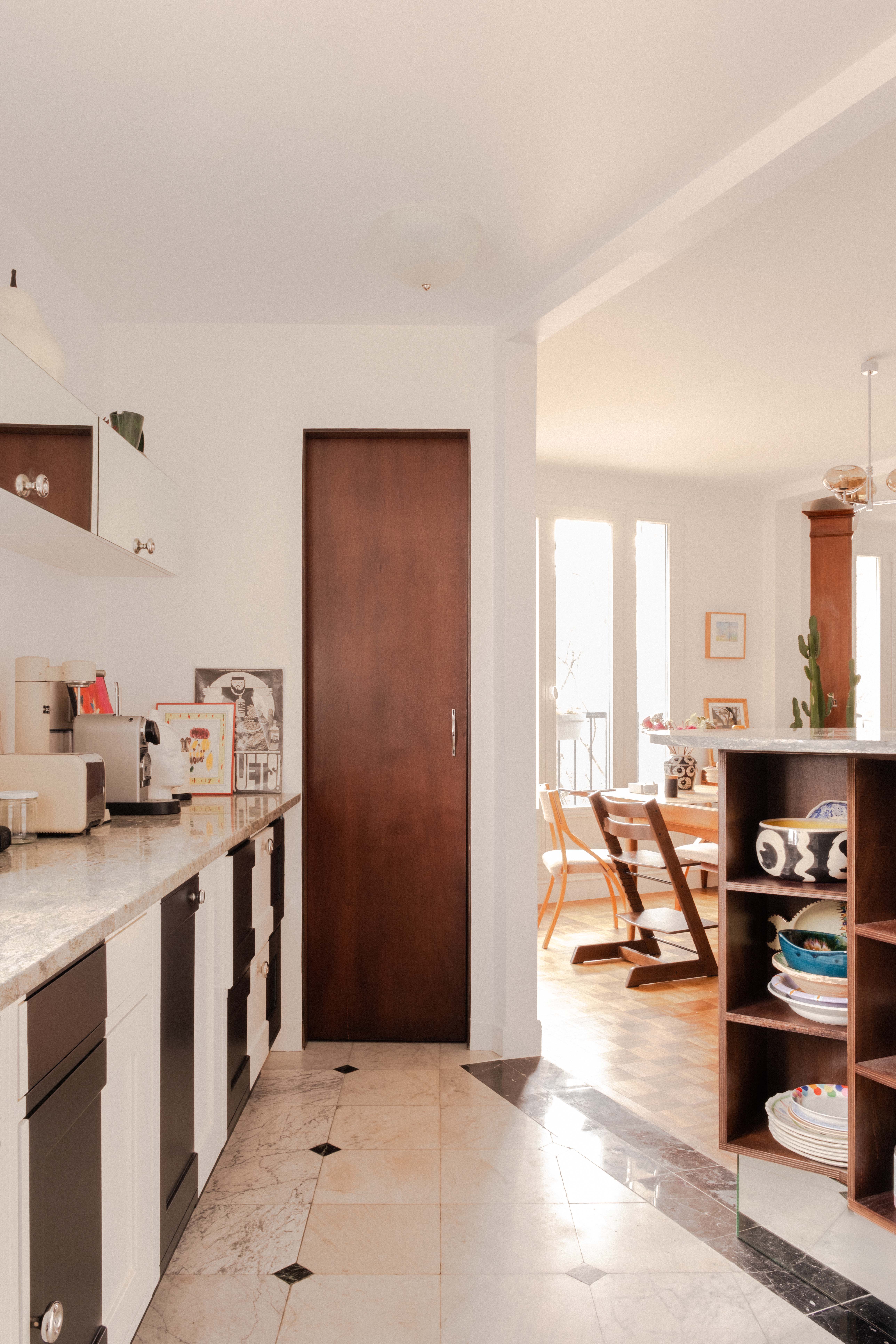 Les teintes et les matériaux sont travaillés afin d'obtenir des effets avec peu de moyens. Les meubles de la cuisine sont conservés, mais la peinture en bandes en change radicalement l'apparence, couplée à l'ajout d'un nouveau plan de travail en marbre de réemploi.