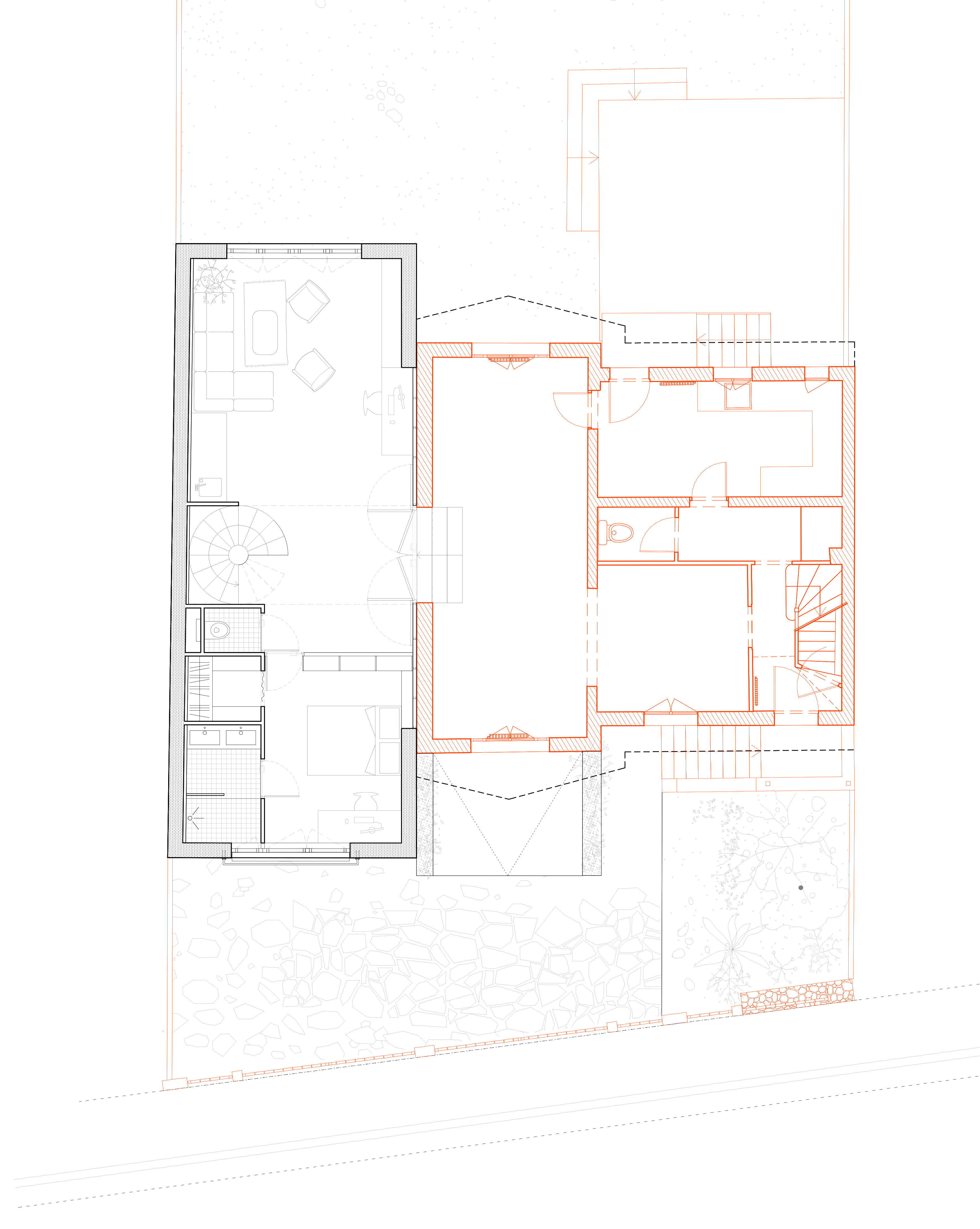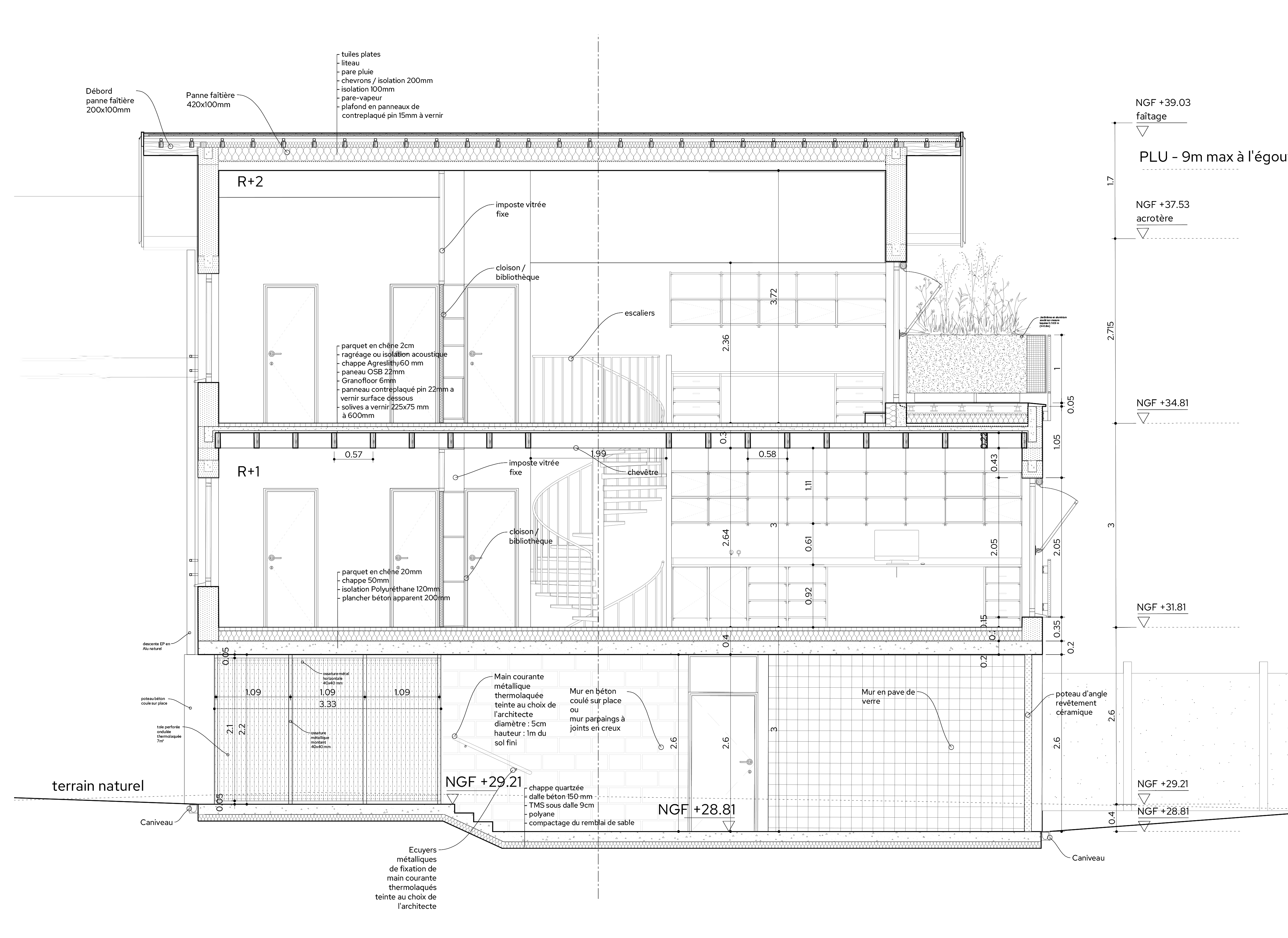 Le projet se compose de deux strates. Au rez-de-chaussée, des espaces ouverts et fermés accueillent stationnement, circulation, local à vélos, atelier et escalier, apportant légèreté et vues dégagées sur le jardin arrière. Aux étages, des espaces plus intimisés reprennent la morphologie typique du quartier, avec une toiture inclinée et un débord de 80 cm protégeant la façade.